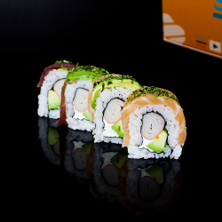 8 uramaki salmón con aguacate, 8 uramaki atún con aguacate , 4 futomaki langosta con aguacate, 4 futomaki de cangrejo con aguacate ,8 futomaki de esparrago Tempurizado Con Aguacate.