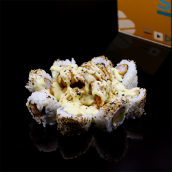Dados de salmón tempurizado, palitos de cangrejo, cremosa, aguacate, salsa tártara, salsa anguila.